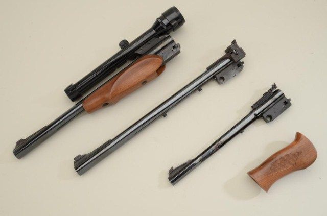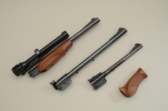 Lot of three Thompson Center Arms barrel assemblies only including a 14” .30-30 Win. cal., barrel with wood fore stock in very good condition mounted with a Bushnell Magnum Phantom scope with very good optics; a 10”barrel in .222 Rem. cal., in fine condition and a “Super-14” heavy barrel (14”) in .223 Rem. cal., in fine condition with adjustable rear target sight, along with an extra adjustable rear sight and a checkered woodpistol grip; all contained in a hardcase. Est.: $300-$400.