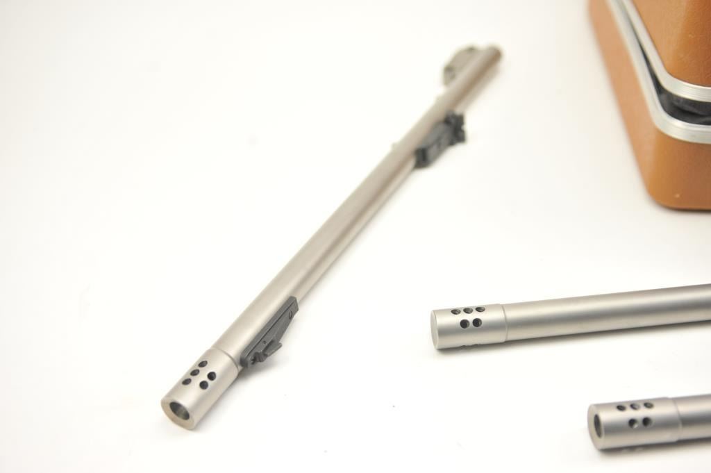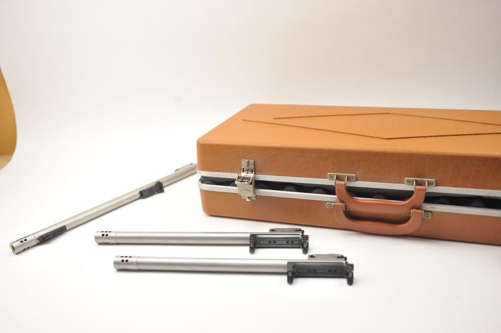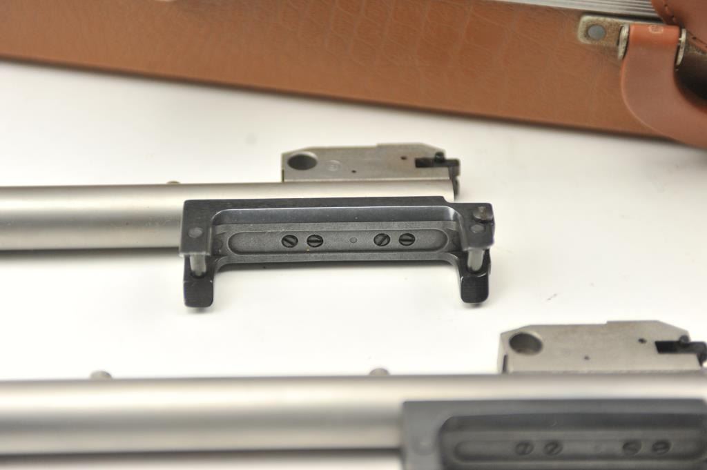 Lot of three Thompson Center barrels including: a “Super 16” in .45-70 caliber, Super 14 in .223 caliber a Super 14 in .44 Remington Magnum caliber. All three barrels are finished in matte stainless steel andported. The two Super 14 models have scope bases added. All three barrels are in very good to fine condition in a Gun guard luggage style case. Est.: $250-$500.