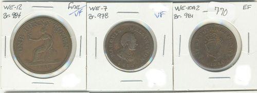 Lot of three Wellington tokens including a WE-7 Breton # 978, WE-10A2 Breton # 981, WE-12 Breton # 984. Grades vary fom about VF to EF.