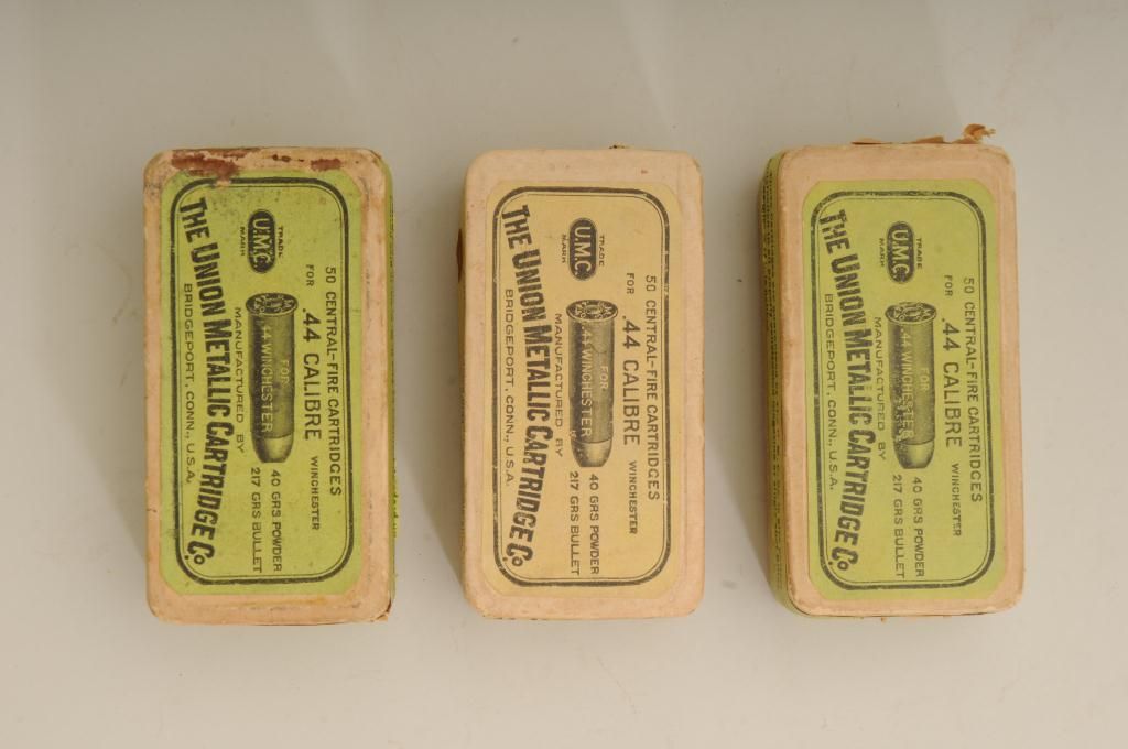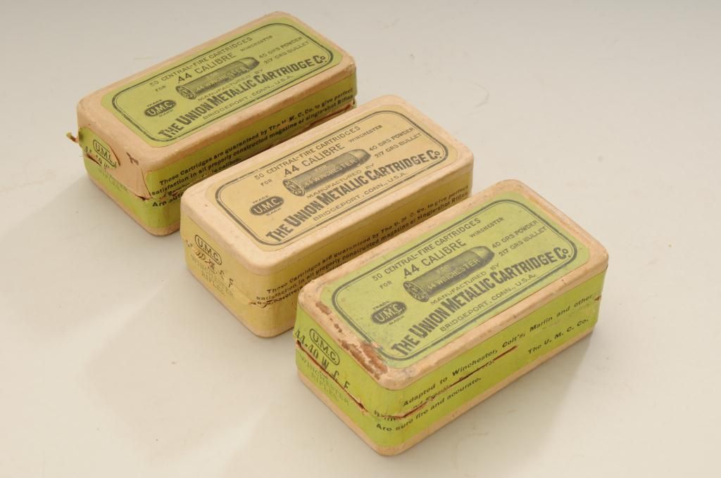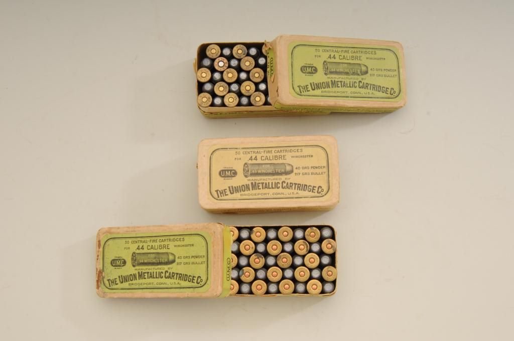 Lot of three boxes of .44-40 caliber cartridges by UMC. One box shows good labels and has been opened contains 46 rounds with matching head stamps, number two box shows faded labels but is unopened with slighttears and tatters, the third box in the lot shows some spotting but good labels and is full with matching head stamps. Est.: $400-$800.