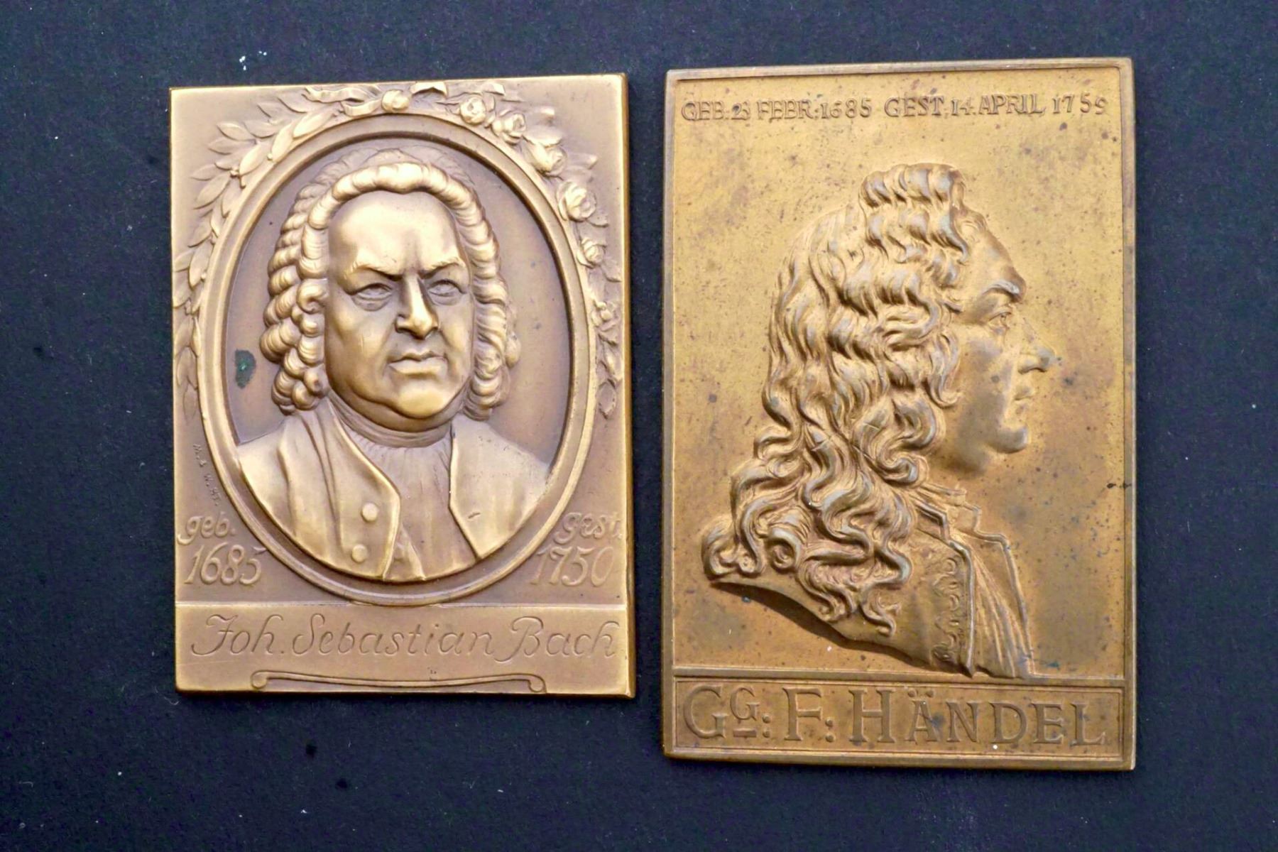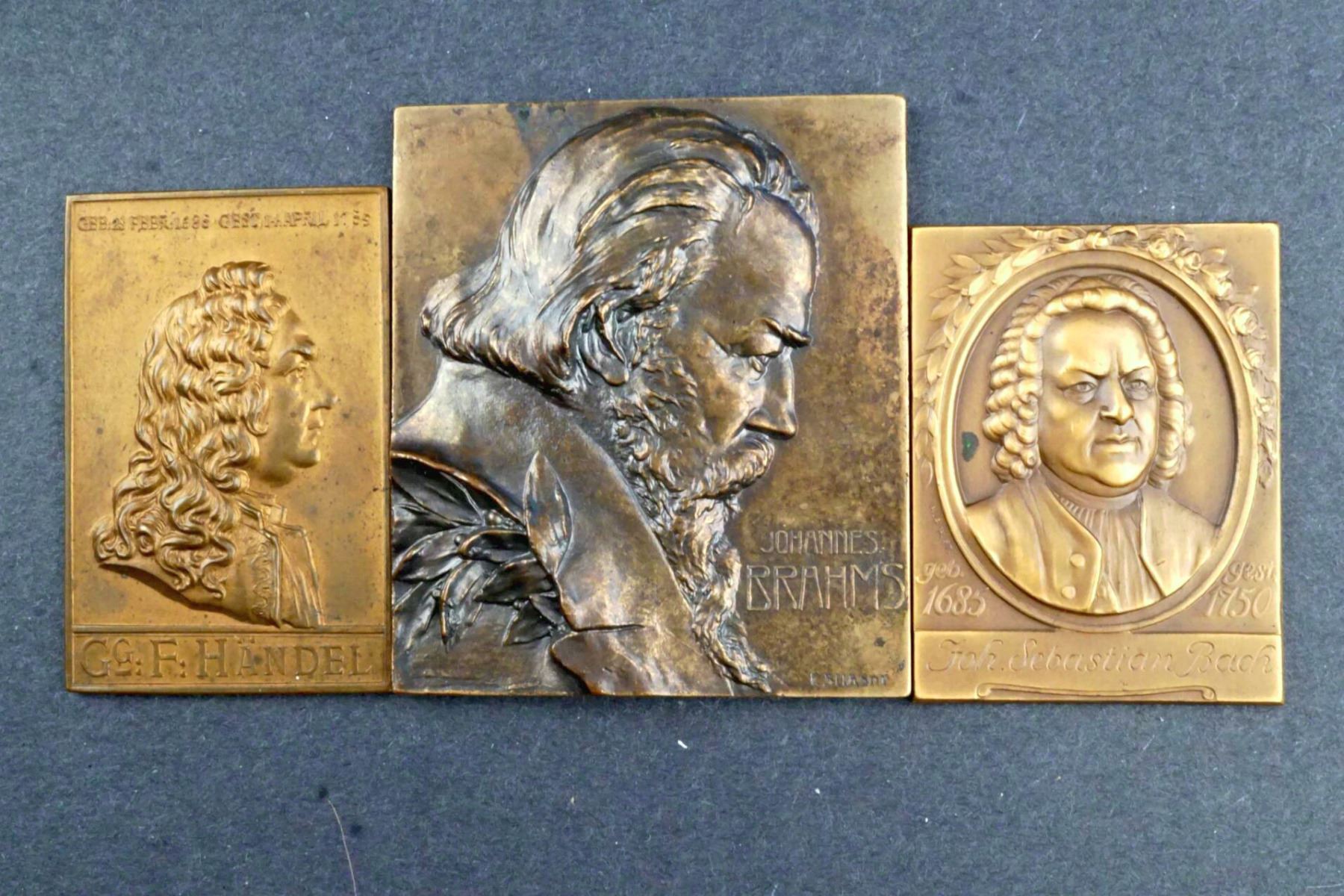 Appear to be of German or Austrian origin. The largest of Johannes Brahms, measures 55 x 62 mm, weighs 76.7 grams, and is in high relief. That of G. F. Handel measures 35 x 55mm and weighs 28.2 grams. That of J. S. Bach, measures 38 x 50 mm, and weighs 35.8 grams. The largest has an incuse reverse, the other two are flat and blank. They are all most likely of late 19th - early 20th century.