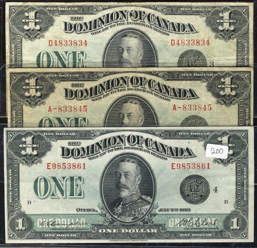 Lot of three different 1923 notes including a DC-25a Hyndman-Saunders "Black seal Group 1", DC-25n "Black seal Group 3", DC-25o "Black seal Group 4". Grades vary from Fine to VF+.