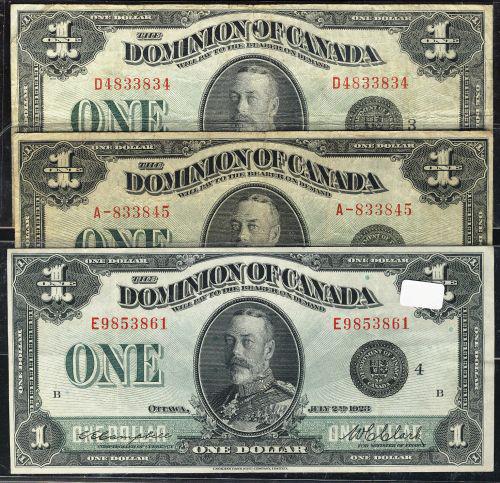Lot of three different 1923 notes including a DC-25a Hyndman-Saunders "Black seal Group 1", DC-25n "Black seal Group 3", DC-25o "Black seal Group 4". Grades vary from Fine to VF+.
