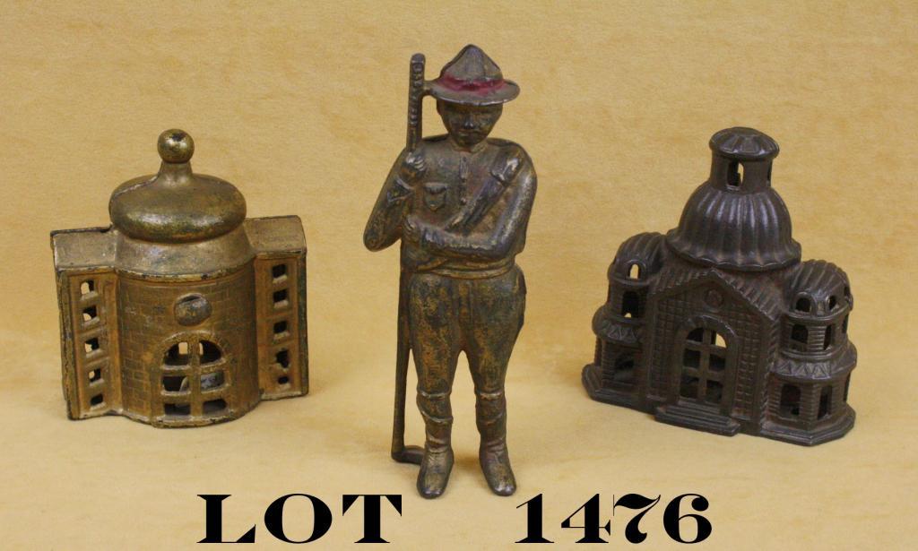 Lot of three early metal banks including a Boy Scout with uniform and staff approx. 6” tall in overall good condition with scattered original gold paint remaining; a bank building style bank approx. 4-1/2” x 4” x2-1/2” with a dark patina and in overall good condition and a circular “rotunda” bank building style bank with considerable original gold paint remaining and approx. 4” x 4” x 2” in overall good condition. Est.:$150-$300.