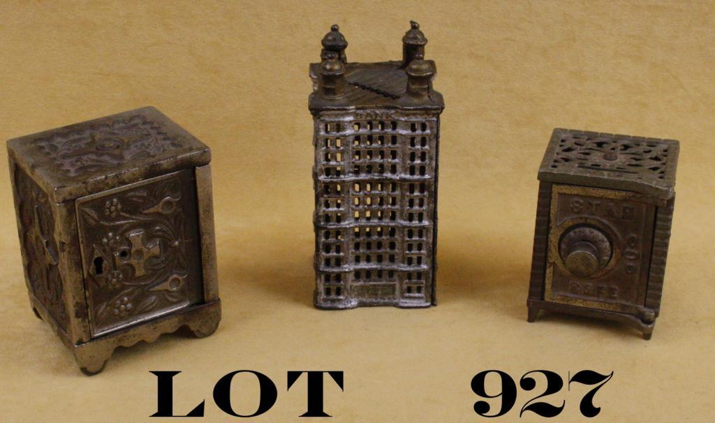 Lot of three early metal banks, two constructed like banks, the first is approx. 4” x 2-1/2” x 2-1/2” and is marked “Star”; the other is approx. 4” x 3” x 2-1/2” and shows a patent date on the bottom of 1897;the third bank is in the form of an old multi-story building approx. 5-1/2” x 2-1/2” x 2-1/2”; all three banks are in overall good condition with some original finish and balances of a dark patina. It’s our opinionthese are original period banks, not modern reproductions. Est.: $200-$300.