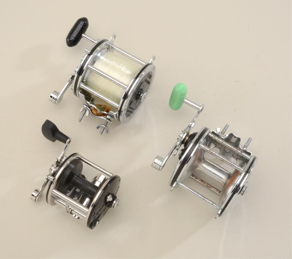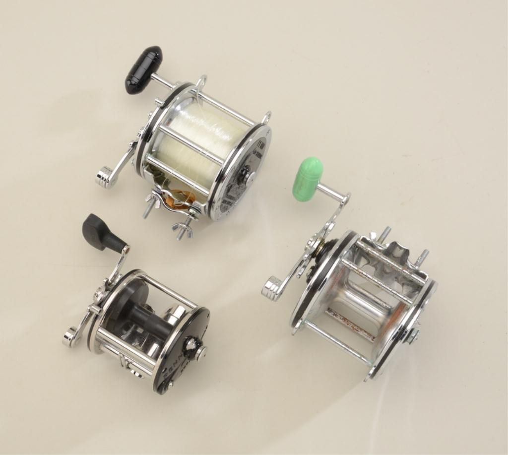 Lot of three fishing reels including a Pen Senator 113 with line in fine condition; another Penn Senator 113 in good condition (no line) and a Penn 209 Level Wind in very good to near fine condition (no line). Est.: $200-$400.