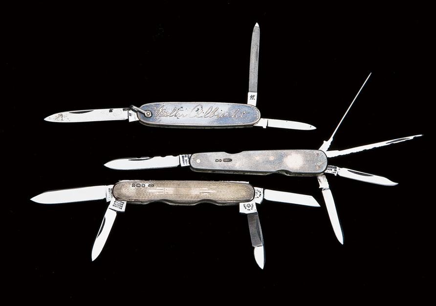 Lot of three items including a two-bladed pocket knife by J. A. Henckels, Germany. Silver scales with some inlays missing. One pen blade and one manicure blade. Second item is five-bladed pocket knife marked “Ibberson”, “Made in England”, “Stainless”. Silver scales, file-worked blade backs, unsharpened. Third item is a four-bladed pocket knife marked “William Rodgers” “I cut my way” “Stainless Steel”. Silver scales, fileworked backspring, unsharpened. From the Hugh Hayes Collection. Est: $300 - $600