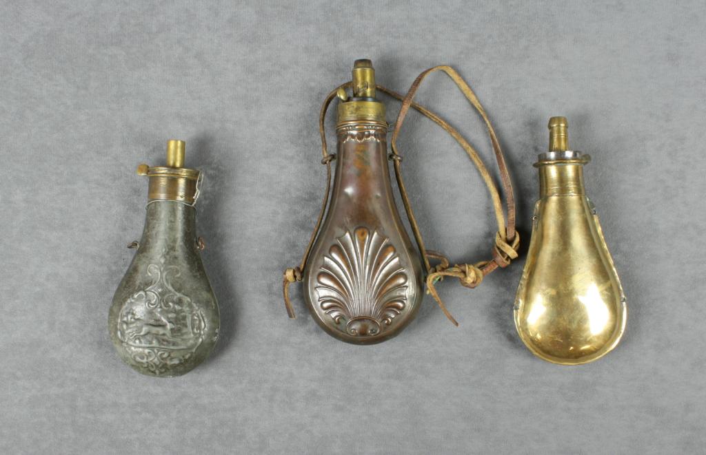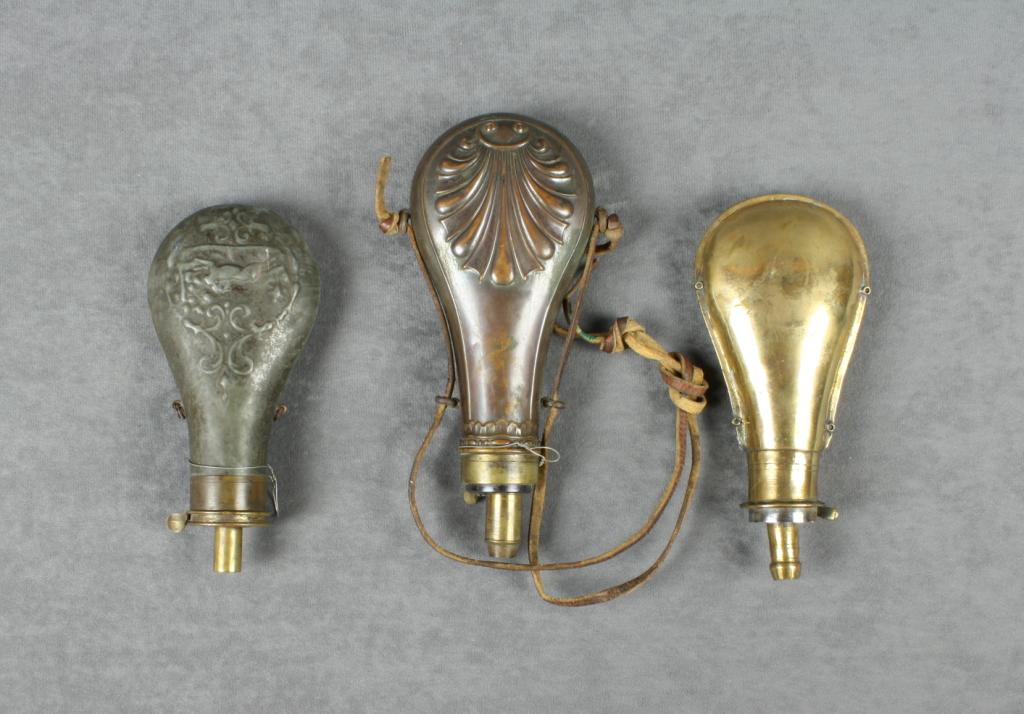 Lot of three large brass shotgun flasks; one  with scallop design, one plain and one cast  metal game scene flask; all in uncleaned  condition.  Est.:  $250-$450.