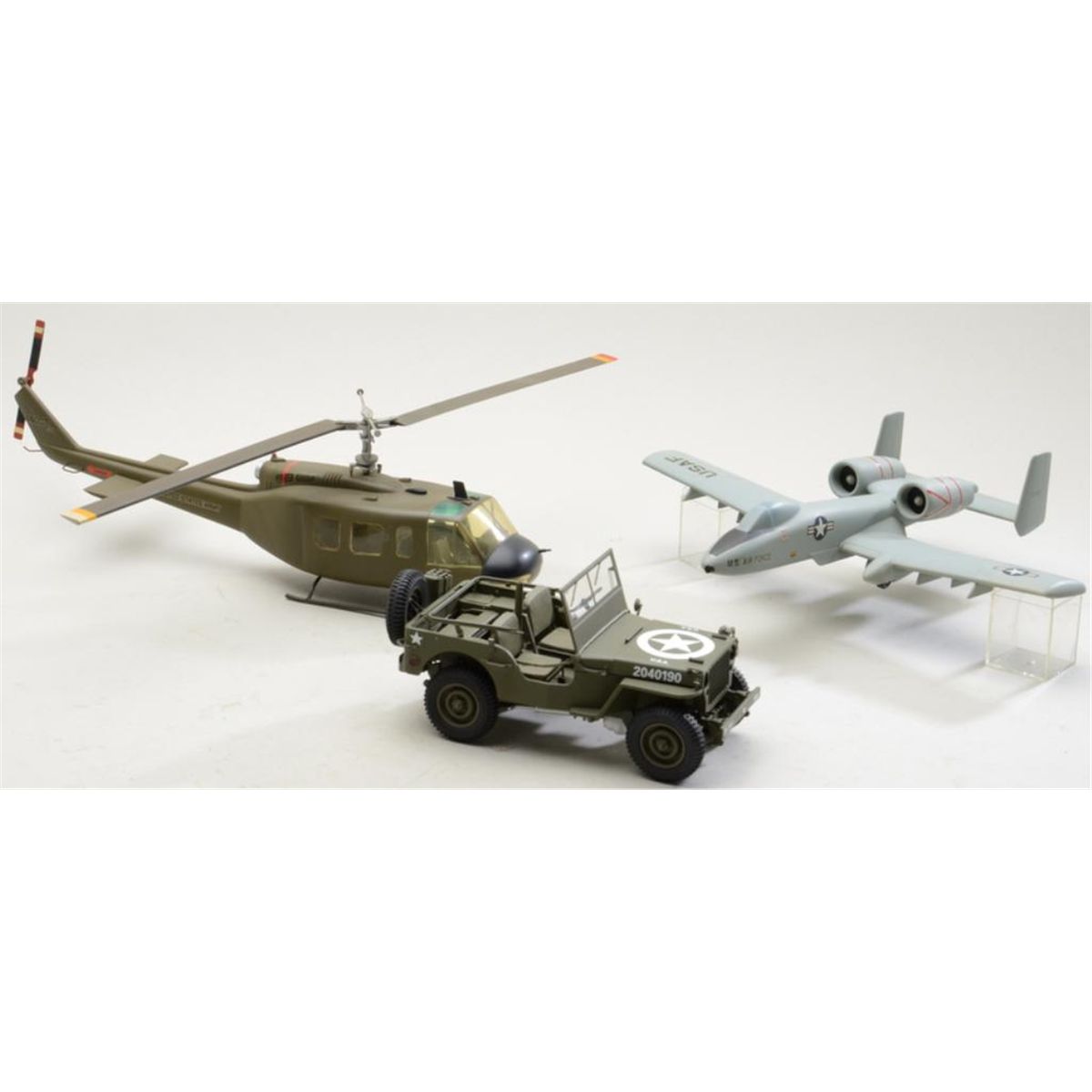 Lot of three military toy models including a Sherman Tank, in the factory box; a helicopter in overall very good condition and a WW II vintage Jeep in very good condition. Est.: $50-$100.