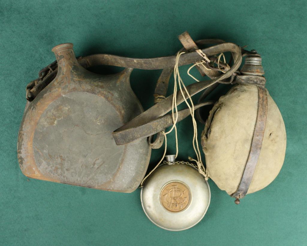 Lot of three misc. collector canteens including a large metal canteen with thick leather strap, a cloth covered metal flask-like canteen with leather strap and a metal and copper Civil War GAR commemorativecircular “hip size” canteen with stopper. The first two canteens are in untouched worn condition and appear to be of European military style. Est.: $75-$150.