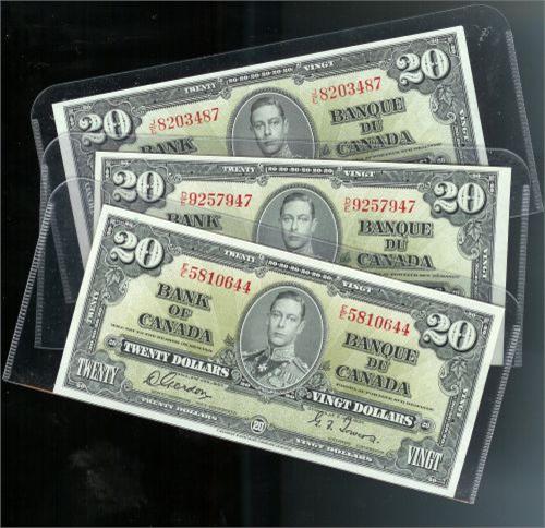 Lot of three notes. BC-25c 1937 $20 Coyne-Towers. Different prefixes: D/E, E/E, J/E Nice and crisp! All Choice uncirculated examples.
