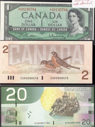 Lot of three notes all UNC, includes 1954 $1 *AA (BC-37bA) w/light miscut error, 2004 $20 with seria
