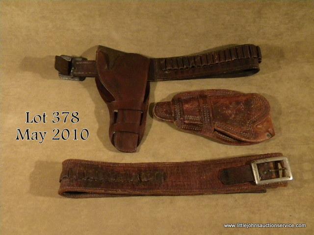 Lot of three old Western pieces of leather including an unmarked tooled leather double loop holster for a medium length barreled Colt SAA revolver in overall fair + condition circa turn of the 19th to 20th century; a cartridge money beltwith great character showing cartridge loops for approx. .38 caliber in overall worn but fair + condition with square belt buckle appearing to be circa pre-1900 and a tooled leather double loop holster appearing to be for a Colt SAA revolverwith a medium length barrel and plain leather cartridge belt with loops of approx. .45 or .44 caliber, both unmarked and in overall good condition. Est.: $200-$400.