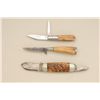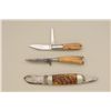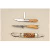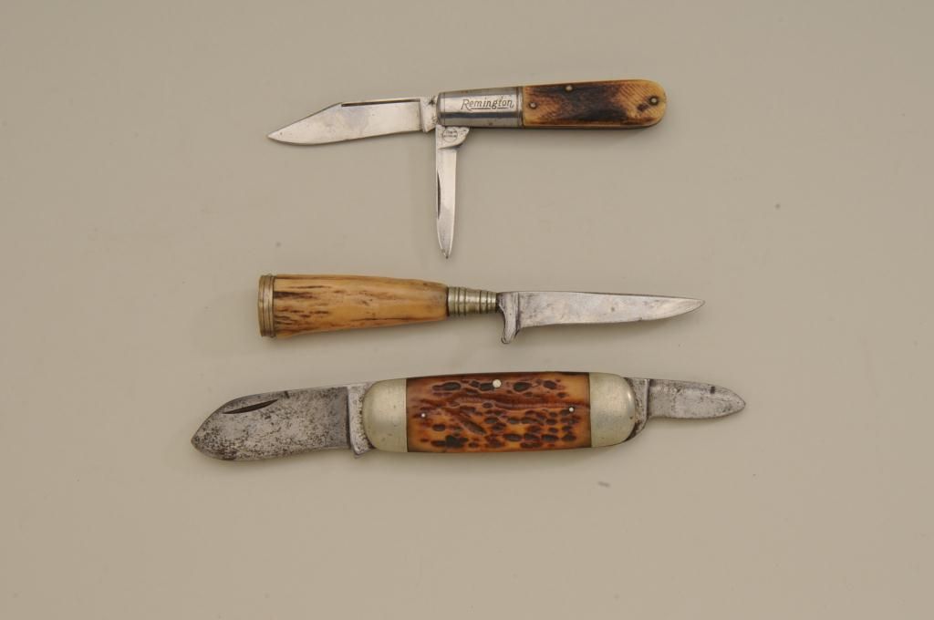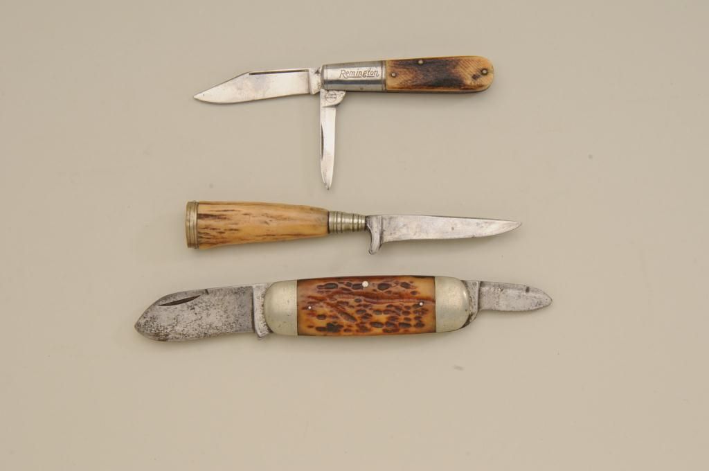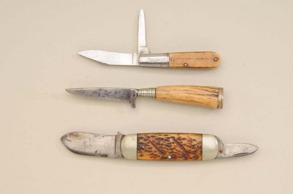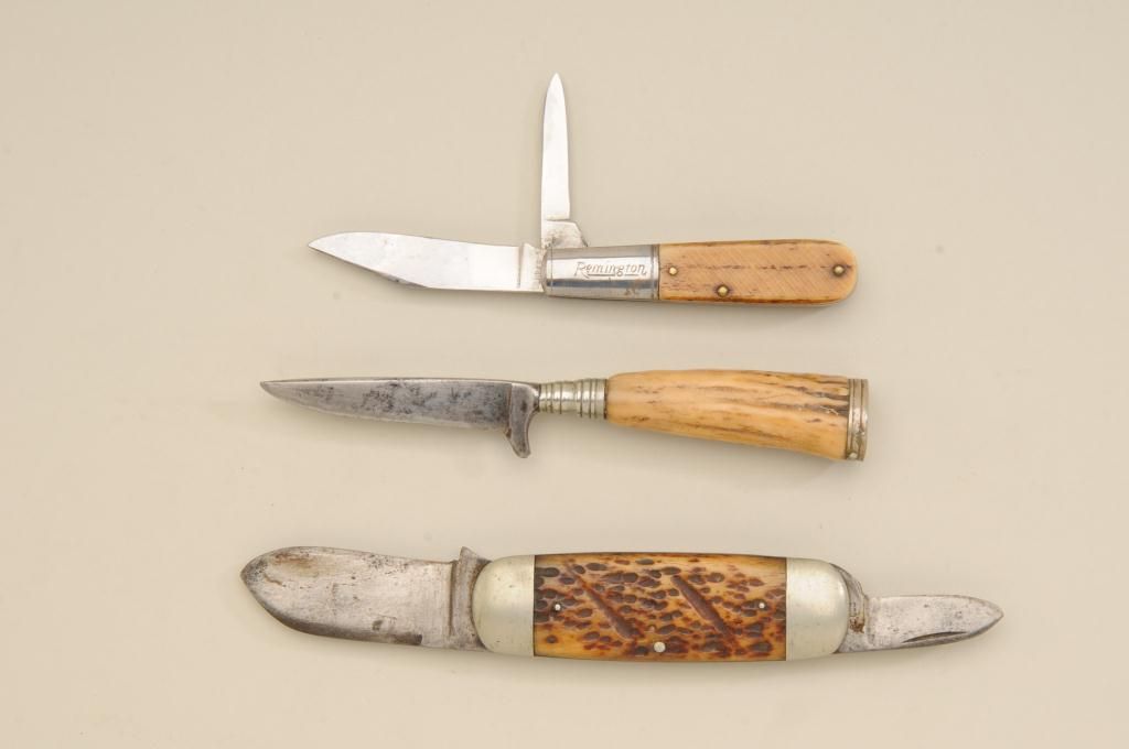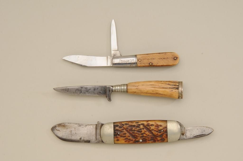 Lot of three old knives. Number one is an elephant toe style marked Cataraugus with stag grips in fair condition showing normal aging and slight sharpening. Number two is a small German style hunting knife with staggrip. Number three is a Remington marked knife with bone grip showing some polishing in fair condition with two blades and some wear to grip. Est.: $100-$300.