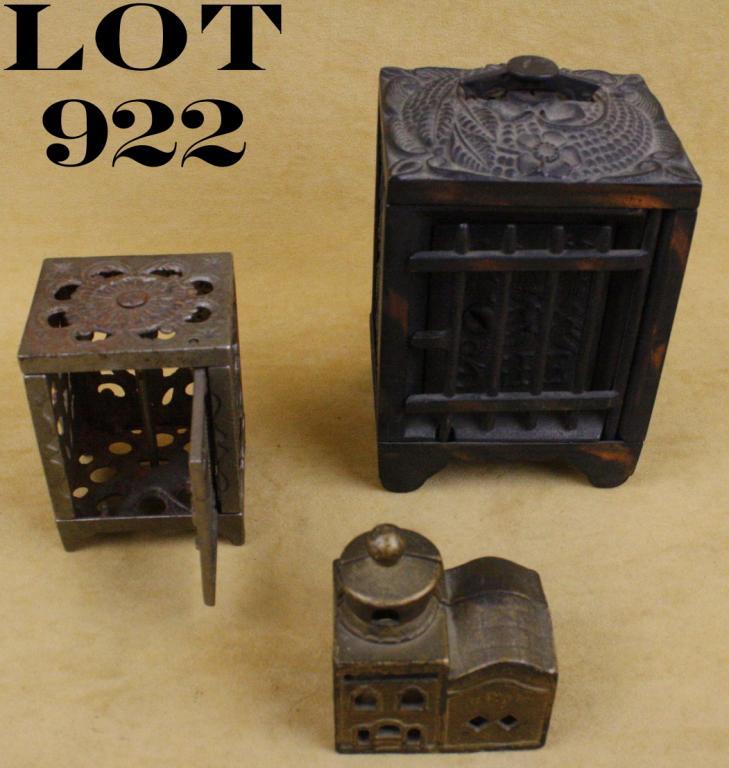 Lot of three old metal banks, all in untouched and overall good condition; first, a safe style bank approx. 3-1/2” x 2-1/2” x 2-1/2”; second is a small bank in the shape of an old church, approx. 3” x 2-1/2” x1-1/2” and a large ornate bank named “Jewel Safe” on the door with an outer grate, approx. 5” x 4” x 3”. Est.: $300-$500.
