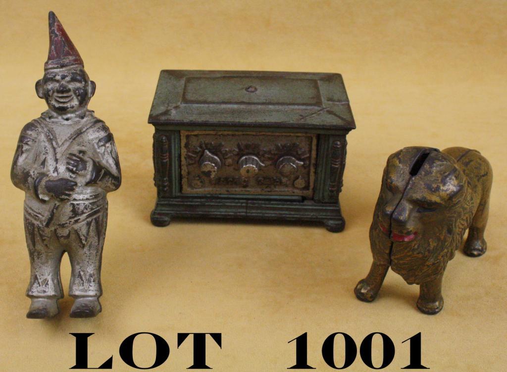 Lot of three old metal banks including a clown approx. 6” tall, a lion approx. 4” x 5”, and a safe “vault” style bank approx. 3” x 5” x 3”. The clown shows considerable traces of original silver on clothing andsome original red on his hat, the lion shows considerable gold on his body with red lips and eyes and the “vault” shows considerable muted green on the body and some silver on the door; all three are with great patinasand uncleaned. Est.: $150-$300.
