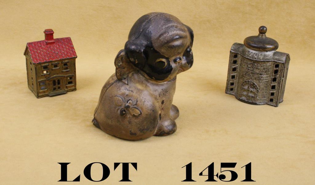 Lot of three old metal banks including a small building style bank approx. 4” x 3” x 2” with considerable original silver paint remaining; a small house style bank approx. 3” x 2” x 2” in overall good condition withgold paint on the house and red paint on the roof and a puppy bank approx. 5” x 4” x 3” showing considerable original paint remaining. Est.: $150-$300.