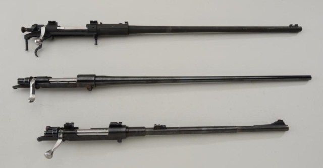 Lot of three receivers, bolts and barrels only including a receiver marked Armeria F.A. Rep Dom 1961, #1398 with 18” barrel, 7mm cal., fair bore; second is a Peruvian Mauser receiver, Model 1909, #10983 with 24-1/2”barrel, 7mm cal., fair bore; third is a U.S. Model 1903 receiver, #1315020 with 24-1/2” barrel, .30-06 cal., fair bore. Est.: $175-$350.