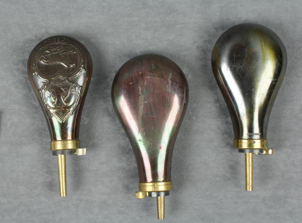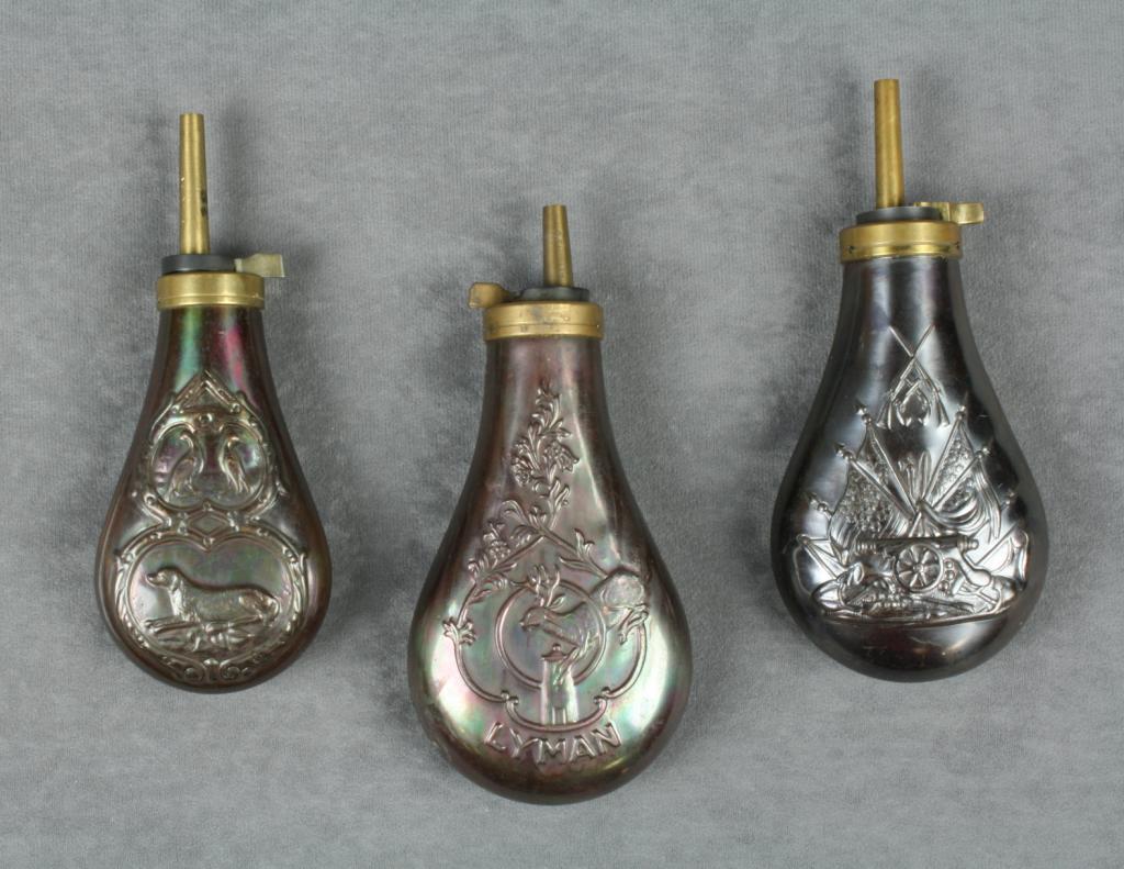 Lot of three reproduction brass embossed powder flasks in overall very good condition. Est.: $75-$150.
