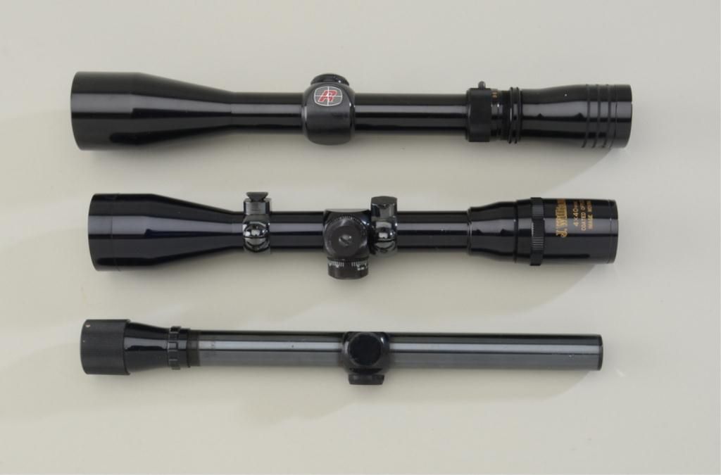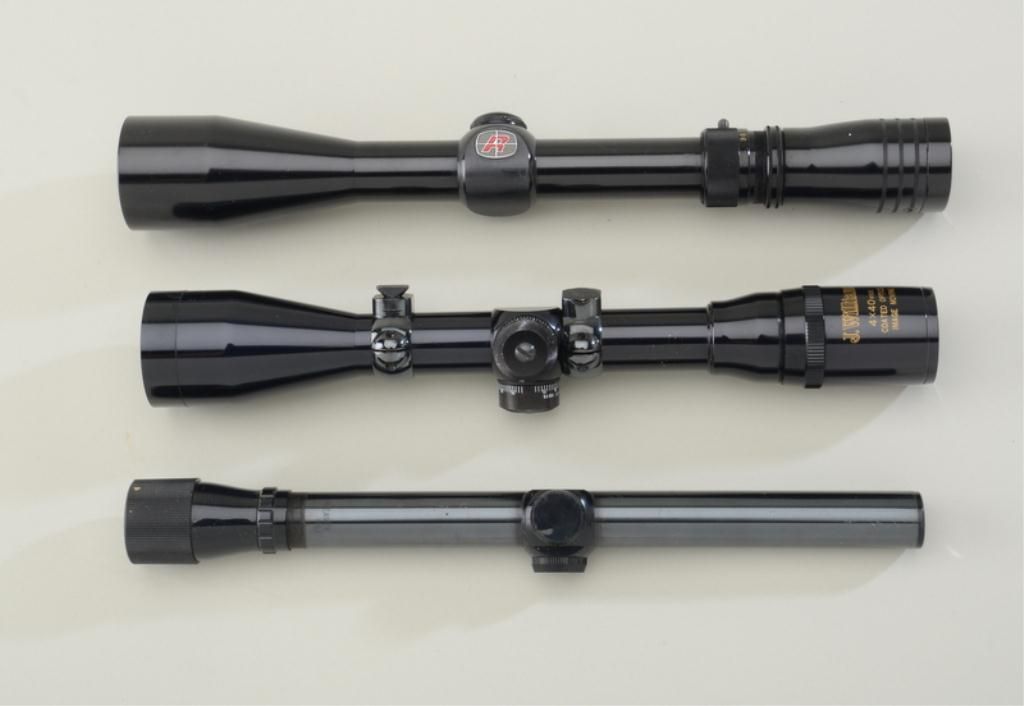 Lot of three rifle scopes including a 3 X 9 Widefield 4-Plex Redfield brand in box in fine condition; a Weaver D4 model in fine condition in a Redfield shipping box and a J. Williams 4X40 wide scope in fine condition. Est.: $75-$150.