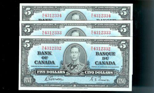 Lot of three sequential notes. BC-23b 1937 $5 Gordon-Towers R/C4312332 TO 334. Choice uncirculated.