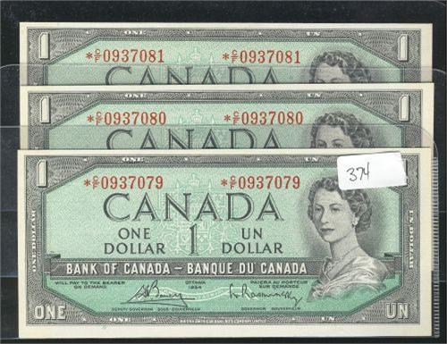 Lot of three sequential notes BC-37cA 1954 $1 Bouey-Rasminski *C/F0937080-82. All notes are Gem!