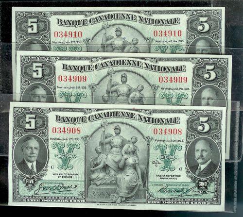 Lot of three sequential notes. Banque Canadienne Nationale 1935 $5, $10 85-14-02. No.034908 -909-910. All notes are original Unc. To Choice Unc.