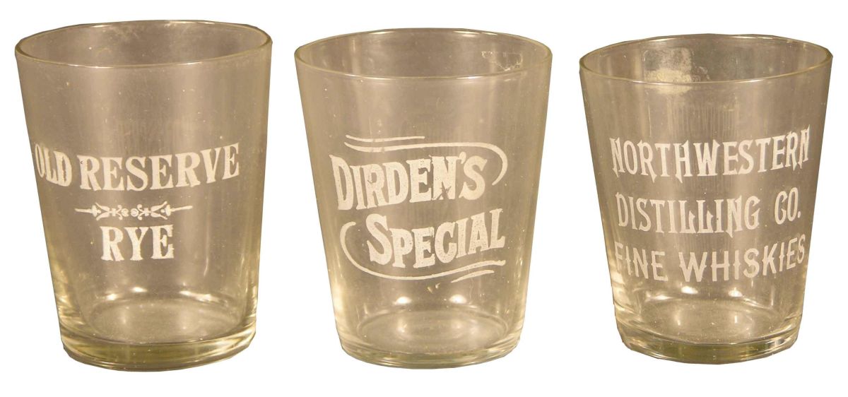 Lot of 3 shot glasses. Including Old Reserve Rye, Dirden's Special and North Western Distilling. No chips or cracks. Each measures 2 1/4 inches tall.
