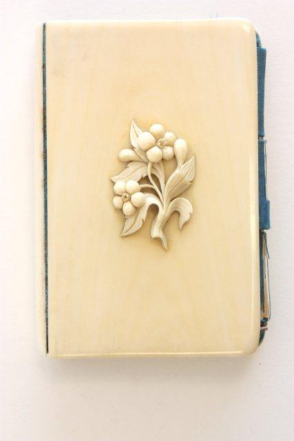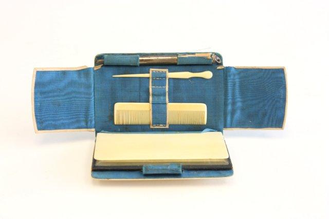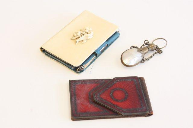 Including: 1-Austrian enameled card case. 1-ivory traveling miniature set. 1-mother of pearl bottle.
