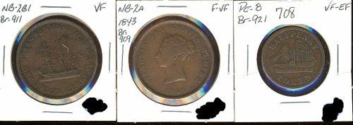 Lot of three tokens including a PE-8 Breton # 912, NB-2A Breton # 909, NB-2B1 Breton # 911. Grades vary from about VF to VF+.