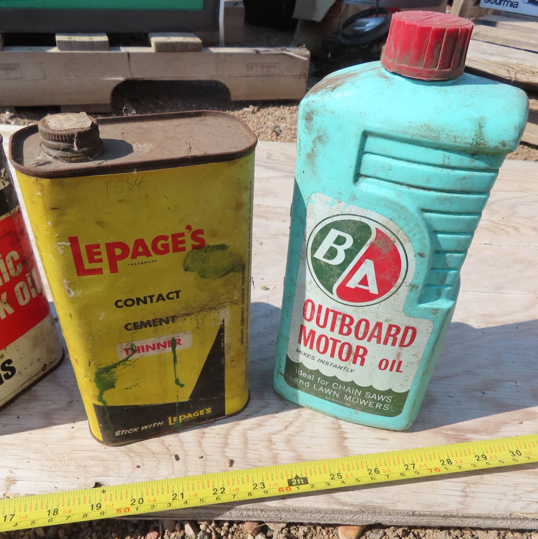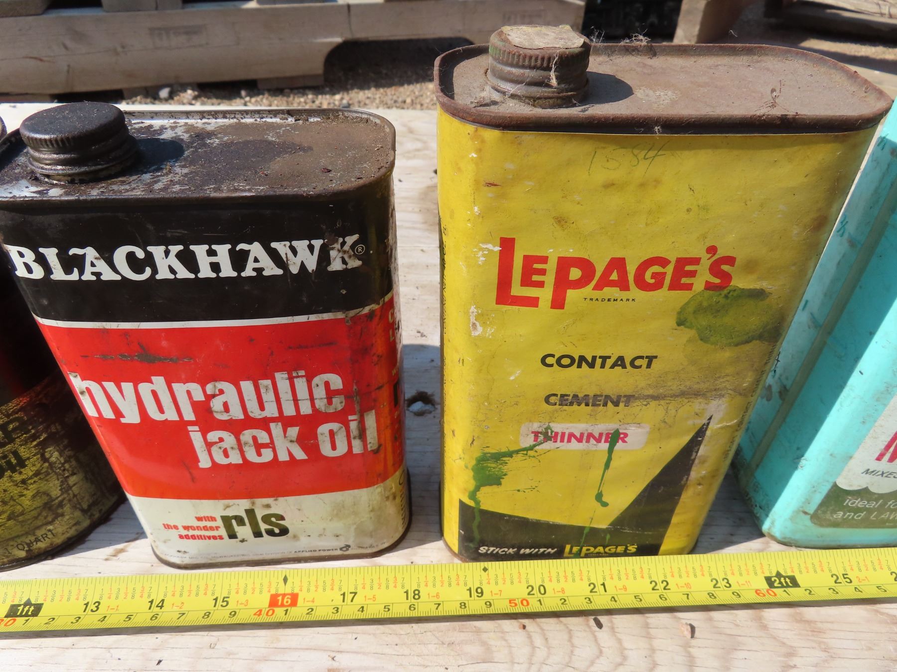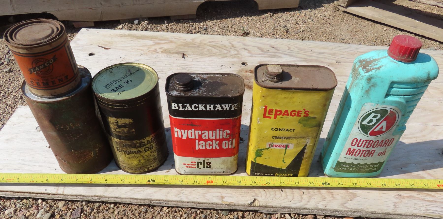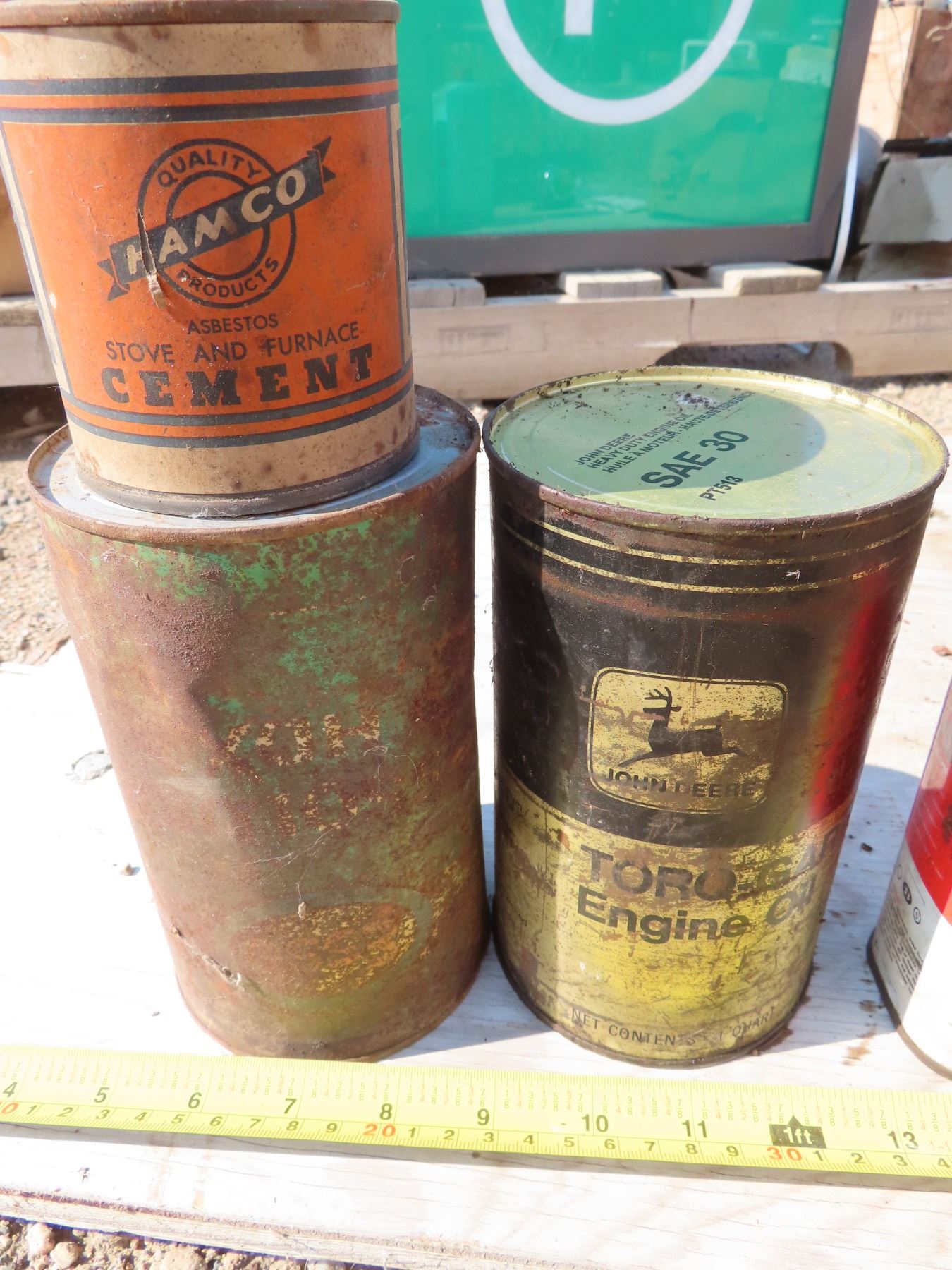 Lot of tins & motor fluids/containers. Includes: John Deere Engine Oil - mostly full