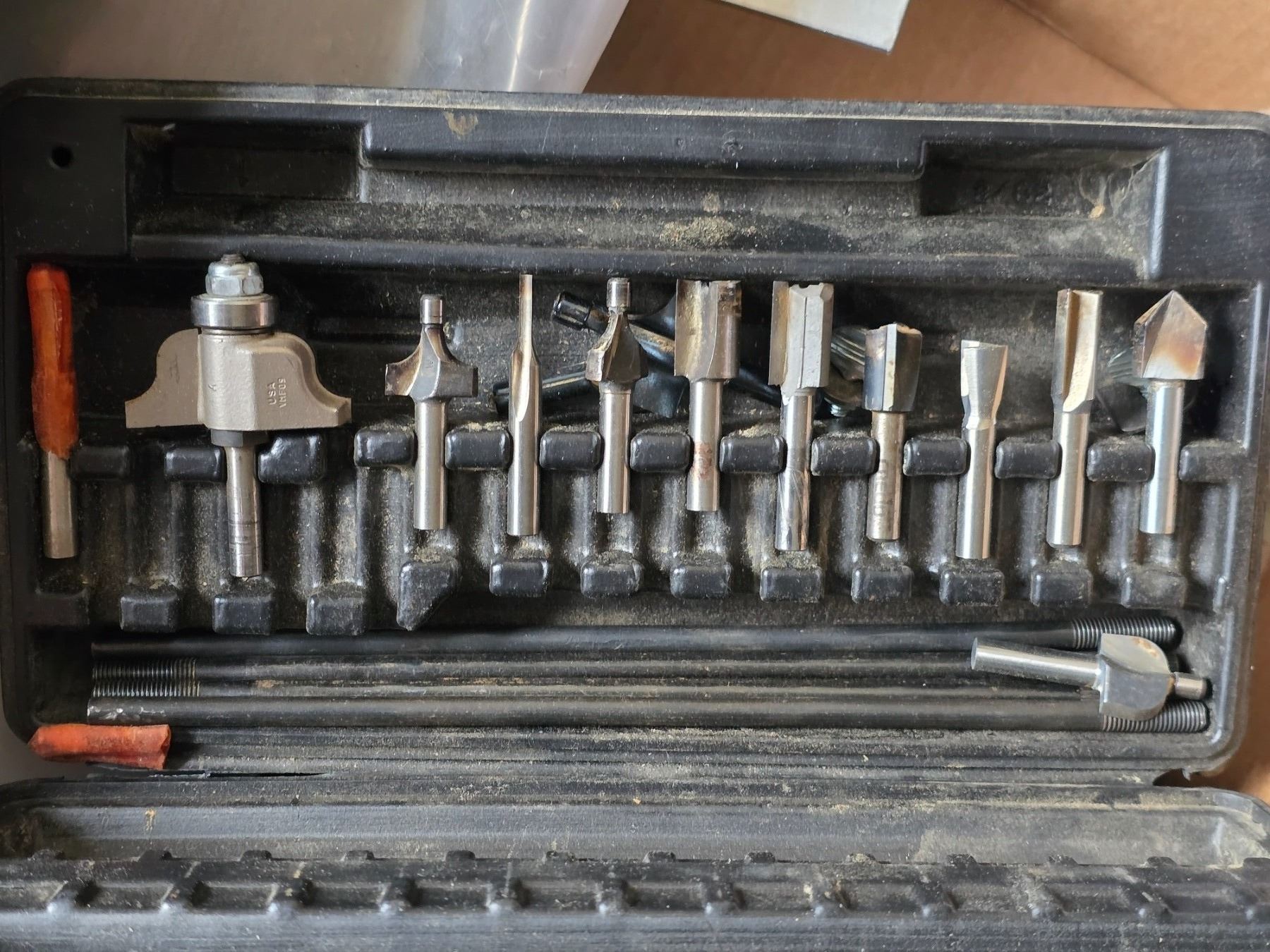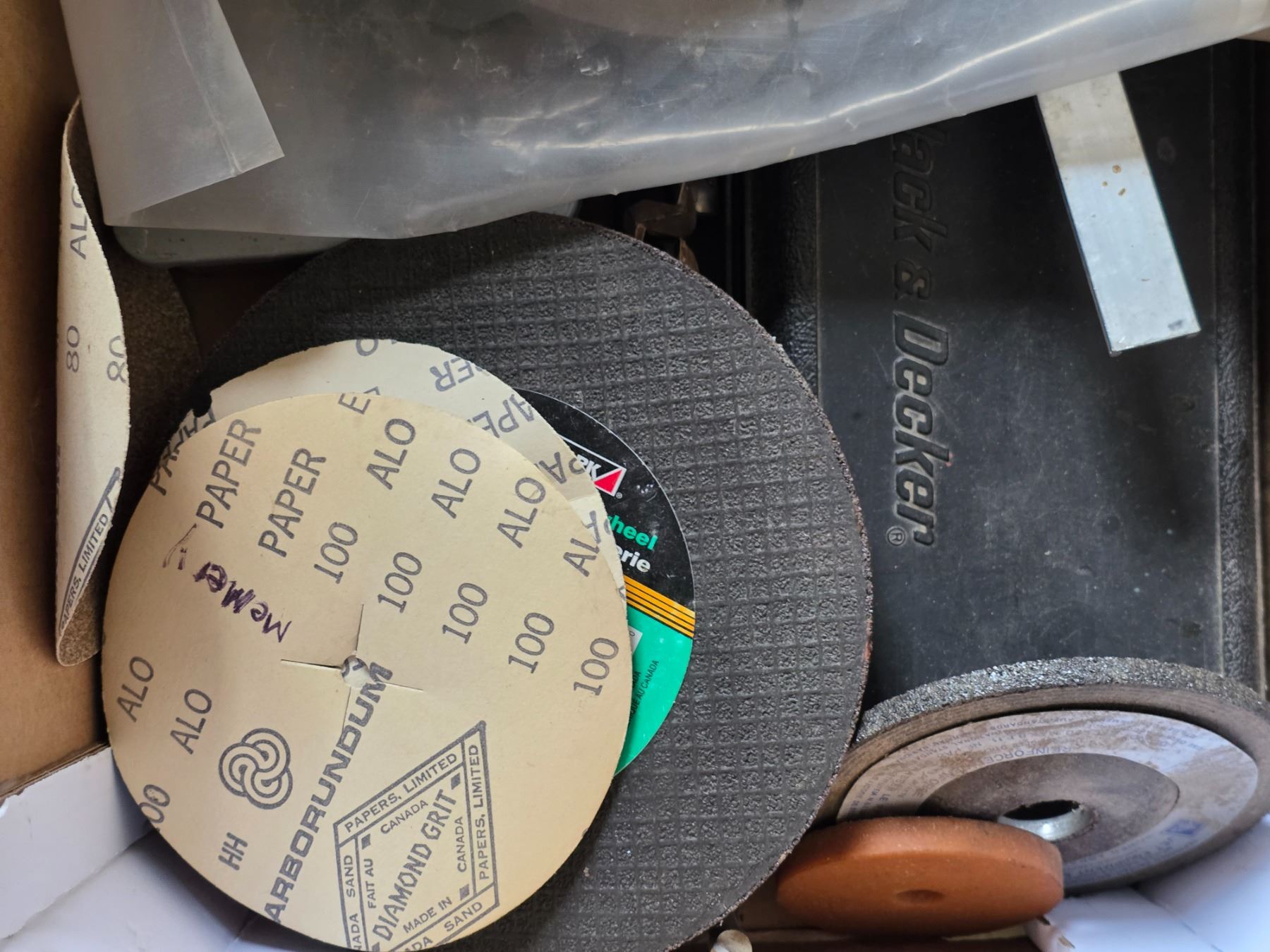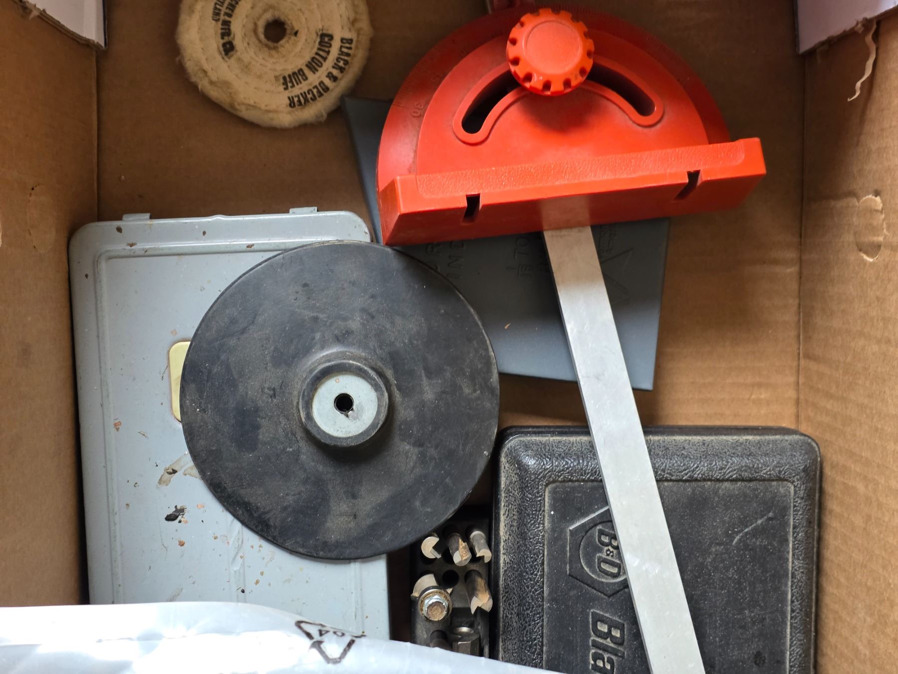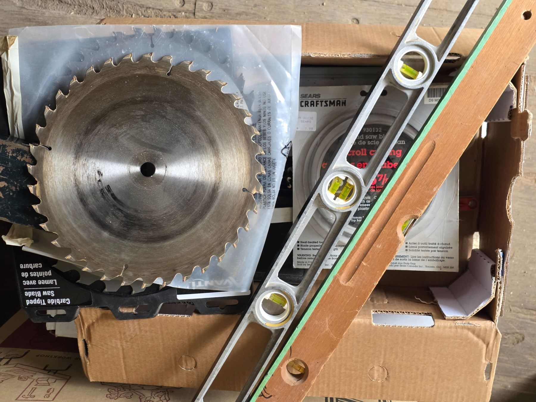 Lot of tools and hardware- saw blades, levels