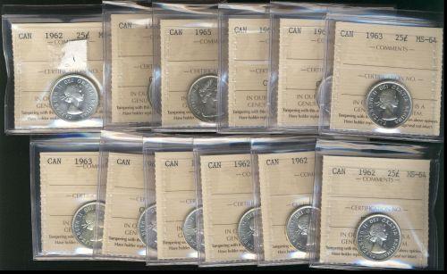 Lot of twelve ICCS MS64 graded coins. There are four examples of each of the following dates; 1962, 1963 and 1965. All coins are brilliant.
