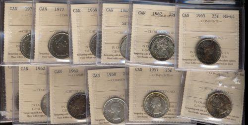 Lot of twelve different ICCS MS64 graded coins. Includes a 1956, 1957, 1958, 1960, 1962, 1963, 1965, 1967, 1968 Silver, 1969, 1977, 1979. Most of the silver coins are superbly toned. Should be viewed. A very nice lot.