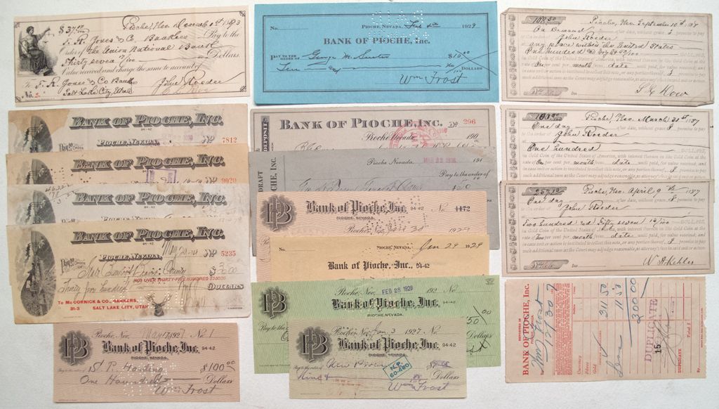 Lot of twenty. Twelve Bank of Pioche checks, nin...