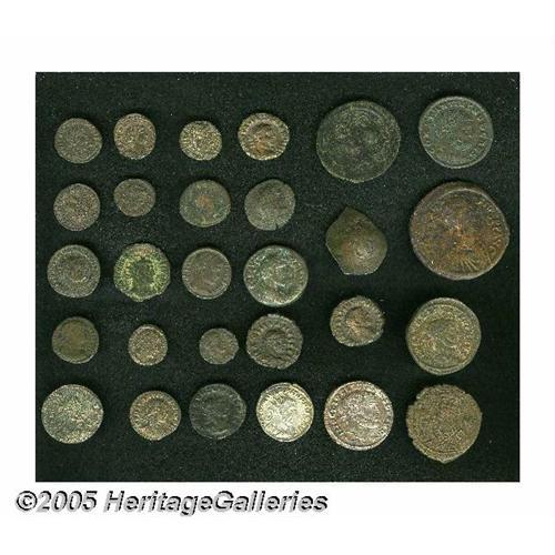 <B>Lot of twenty-eight miscellaneous ancient coins, mostly AE.</B></I> Includes: Greek: Uncertain // Provincial: Egypt, Alexandria. Antoninus Pius. Tetradrachm // Diocletian // Maximianus (2) // Imperial: Philip I // Aurelian // Diocletian // Constantius I, as Caesar // Constantine I (2; including one as Caesar) // Delmatius // Constantius II, as Caesar // Miscellaneous low grade late Roman AE (11) // Byzantine. Anastasius I // Maurice Tiberius // Phocas // Late trachy. The late Roman group mostly Fine, the rest average Fine to good VF.