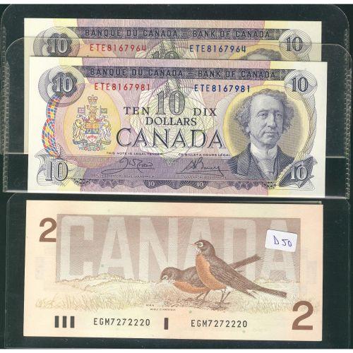 Lot of twenty notes BC-49d 1971 $10 Crow- Bouey (2), BC-55b-i 1986 $2 Thiessen-Crow EGM7272203 to EGM7272220 (18),