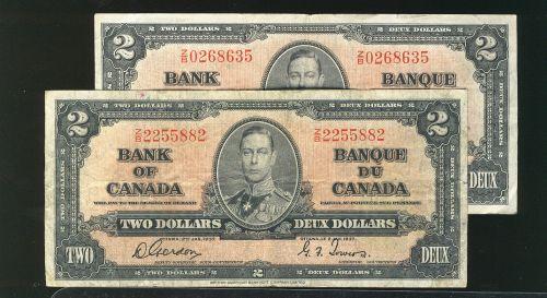 Lot of two 1937 $2 notes BC-22b with the very scarce prefix Z/B. Grades vary from Fine to F+.
