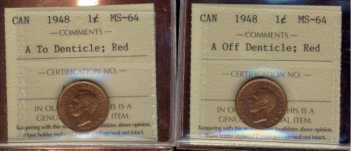 Lot of two 1948 1¢. Includes both 1948 "A" to dent. And "A" off dent varieties. Both ICCS MS64 red.