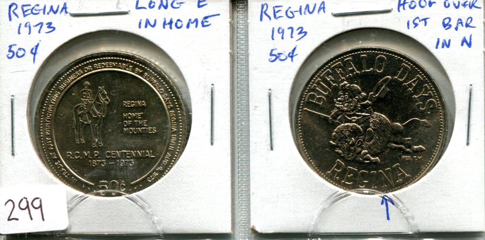 Lot of two 1973 Regina 50 Cents Trade Dollar Varieties. Includes Long E in HOME & Hoof Over First Bar in N in REGINA.