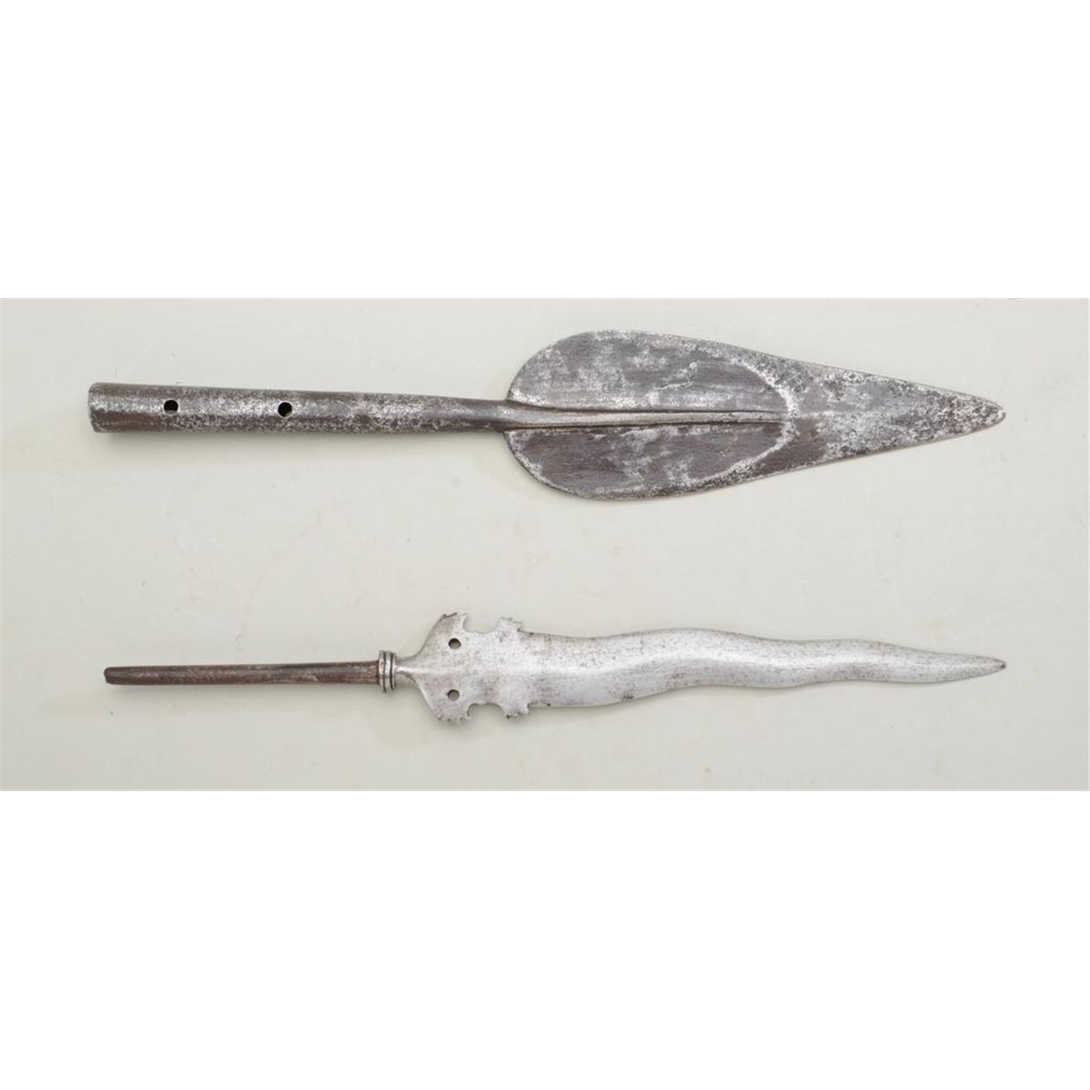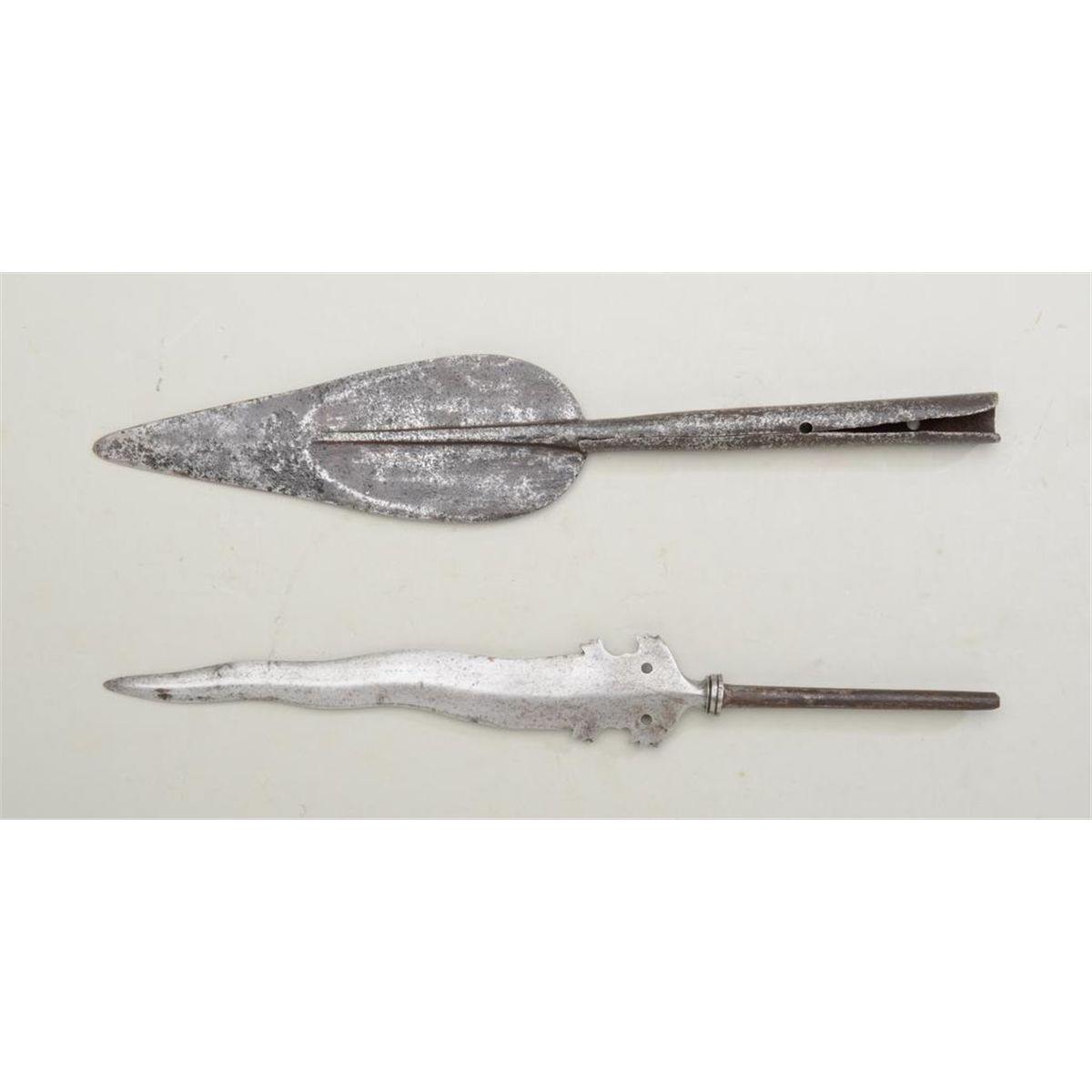 Lot of two 19th century iron spearheads including one that appears to be African, approx. 14” overall with an approx. 8” fan shaped blade with dark patina and scattered light to moderate erosion; the otherappearing to be Indian or mid-eastern approx. 14” overall including the shaft and with an approx. 10” wavy blade with cutting notches at the hilt; also in very good condition with a pleasing grey patina. Est.: $200-$300.