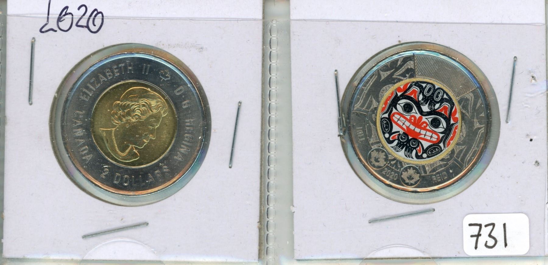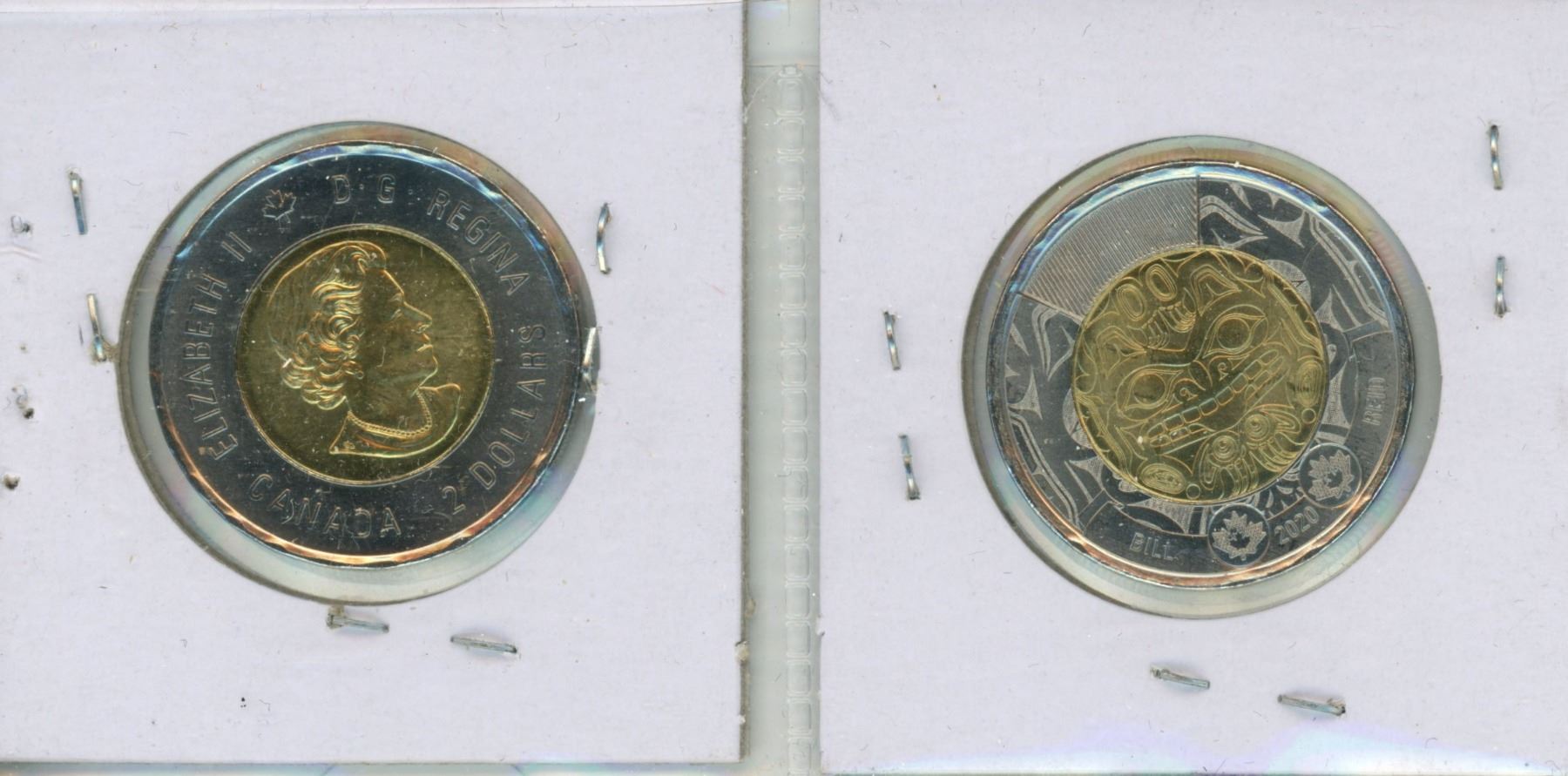 Lot of two 2020 Canada $2.00 coins toonies incuding bill reid color