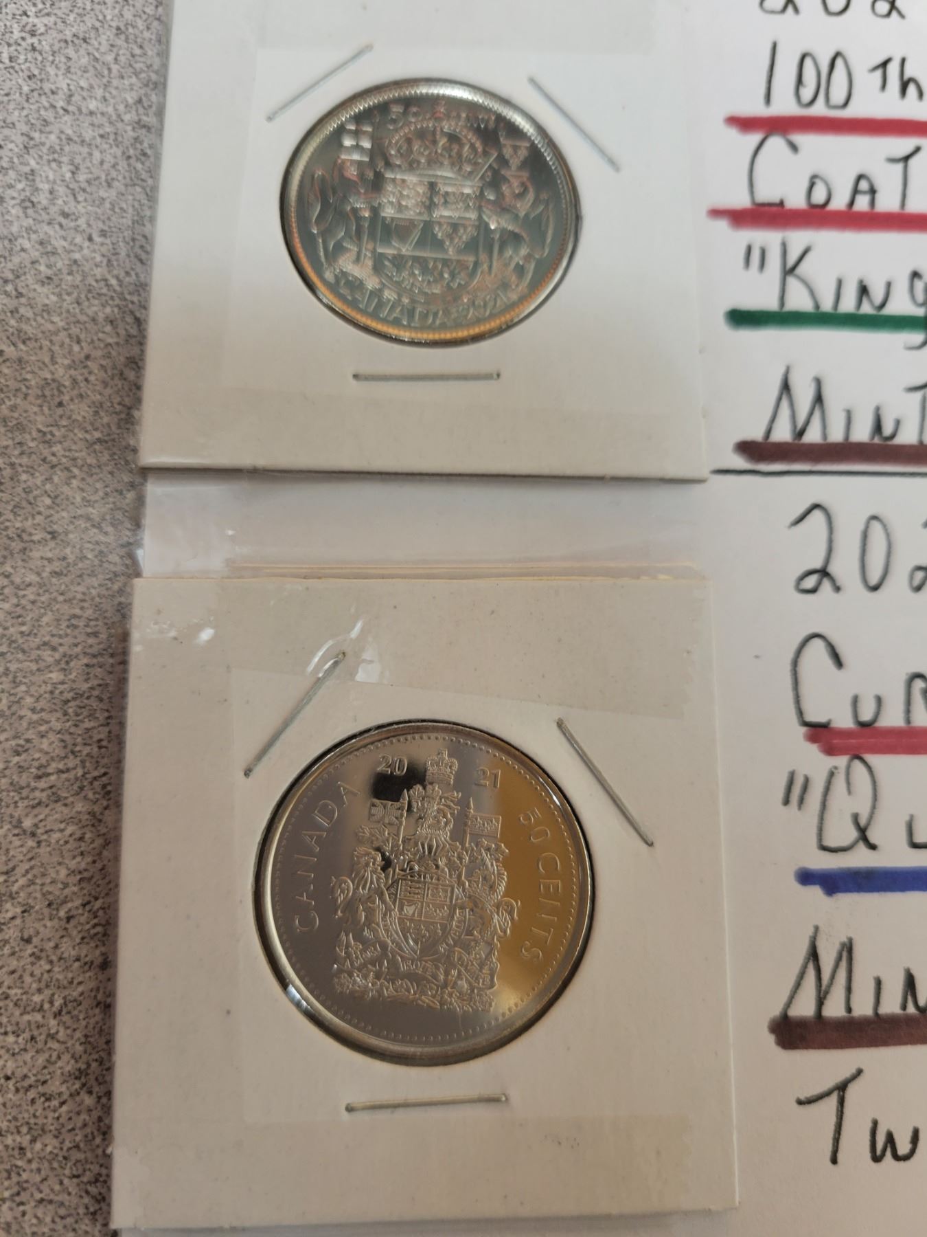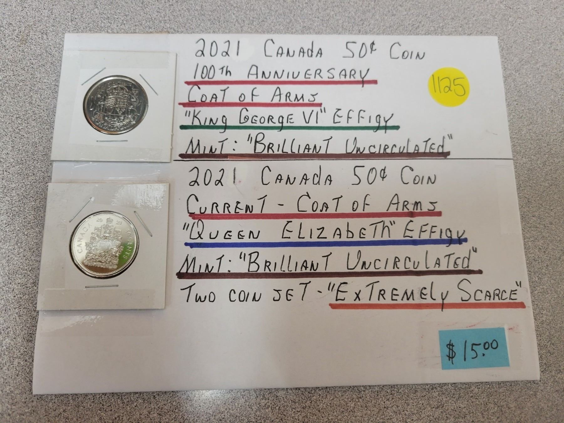 Lot of two 2021 Canadian 50¢ coins - one with 100th anniversary coat of arms and one with current coat of arms