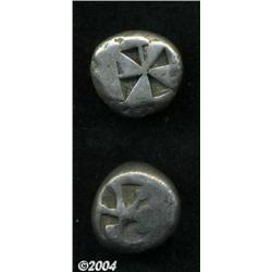 Lot of two AR staters from Aigina. Includes: Ca. 550-ca. 500 B.C. Sea turtle / Skew pattern. SNG Delepierre 1580-9 // Ca. 500-ca. 480 B.C. Same types, but reverse skew of unusual form. SNG Delepierre 1688-1702, esp. 1692. Each grade Fine and have a countermark on shell.From the Morris Geiger Collection. 2 coins Important notice: Heritage usually auctions material at the rate of 200-250 lots per hour. On some occasions eBay Live bid software or the Internet may not be able to keep up with the pace of the auction. We recommend placing a realistic absentee bid now as insurance to avoid disappointment. Occasionally the auctioneer may eliminate or reject an eBay Live bid, and the auctioneer may also reopen a lot after the close of the eBay live bidding (usually because we missed an audience bid), and may reject your bid even if it shows you as the winning bidder. By bidding via eBay Live, you agree that Heritage may award the lot to another bidder at its sole discretion under the circumstances described above or any other reasonable circumstances. Also please note that all Heritage lots purchased through eBay Live carry a 20% Buyer's Premium. Please make sure you read the Terms and Conditions before you bid.