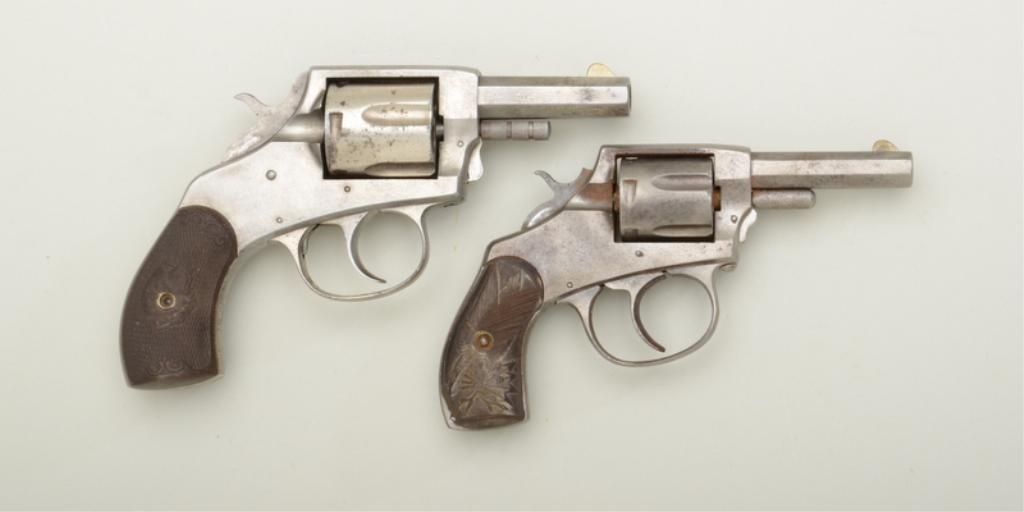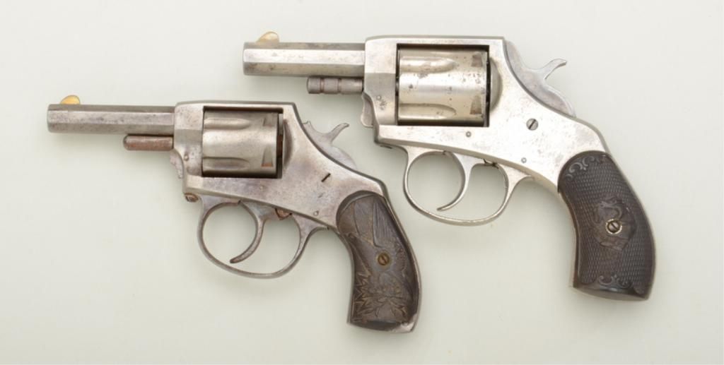 Lot of two American Bulldog DA pocket revolvers including a .38 cal., DA with 2-1/2” barrel, traces of nickel finish, dark bore, action needs adjustment, grips are hard rubber and very good overall with dog heads; the second gun is a smaller frame DA in .32 cal., 2-1/2” barrel showing an old cleaning and missing internal parts; grips are chipped and the right grip as been partially ground; project or parts gun. Est.: $100-$200.