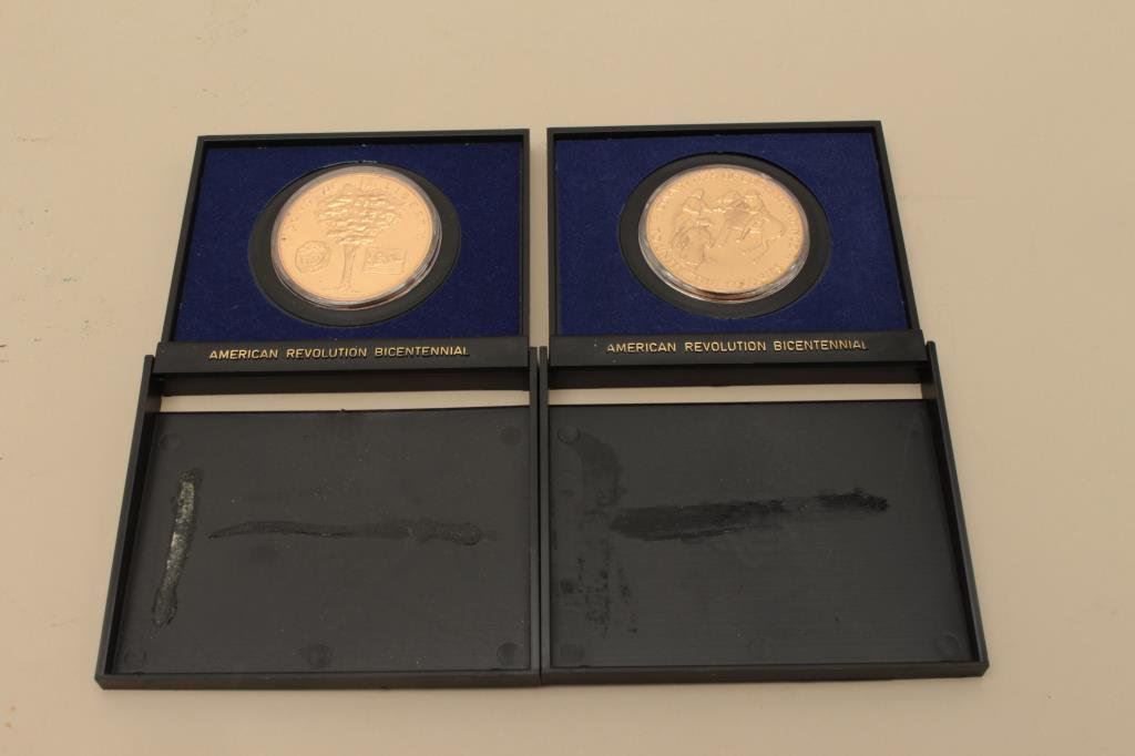 one coin with a bust of George Washington and the Liberty Tree on the obverse. The second coin has Samuel Adams and Patrick Henry on the front with the Committees of Correspondence on the obverse. The coins are dated 1972 and clad in a gold tone finish. Est.: $50-$100.