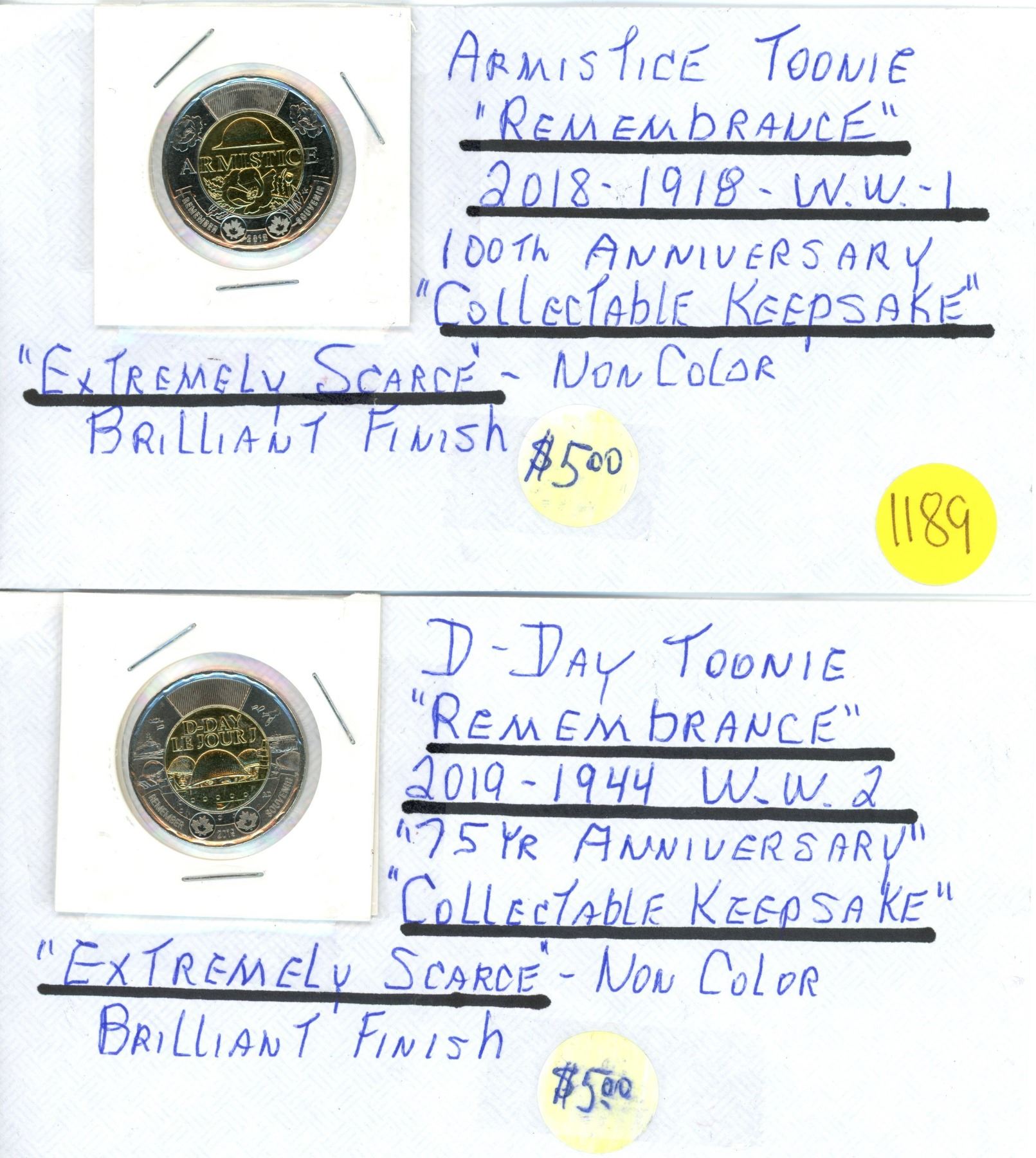 Lot of two Canadian $1.00 loonies - Armistice WW1 remembrance & D-Day Remembrance WW2