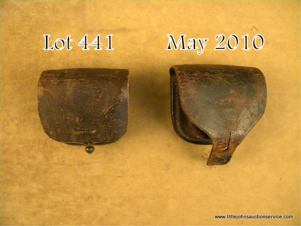 Lot of two Civil War era leather cap pouches; one in overall fair + to good condition showing remnants of an inspector’s cartouche on the front top flap with some slight crazing of leather but complete; the second is in fair + conditionshowing no markings and missing the stitched on cover flap piece but otherwise complete. Both would benefit greatly from a little TLC and feeding of the leather. From the estate of C.W. Slagle. Est.: $100-$200.