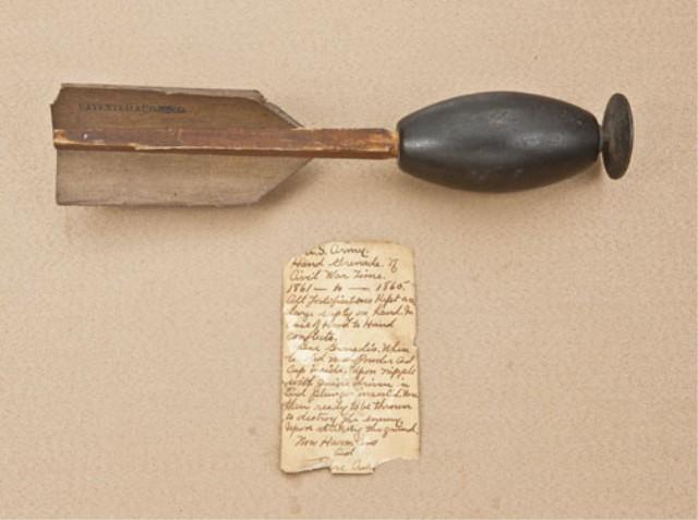 Lot of two Civil War hand grenades, one shows wood and cardboard fins which are marked “Patented Aug 20, 1861. Shows removable firing pin at front where cap is placed. Powder is inserted in the rear, and plug with wooden shaft with arrow type fins. Measures approx. 13” in height, metal body measures 5-1/4”. Very good to near fine condition. With old hand-written tag from the Liberty store, Central City, Nebraska. And a more standard Civil War hand-grenade with wick type fuse, which wa lit and thrown. Est: $500 - $1,000