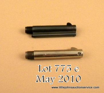 Lot of two Colt SAA barrels, the first is a 4-3/4” nickled in .38 WCF cal. in excellent condition and the second is a beautiful restored blued and etched paneled “Colt Frontier Six Shooter” SAA 4-3/4” barrel showing approx. 97% reblue andapprox. 98%+ of the restored etched panel (probably by Tom Haas, Sr.), ejector housing is also attached to this barrel and is in like condition. Est.: $400-$800.